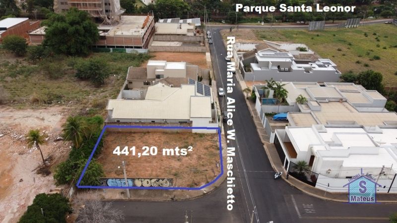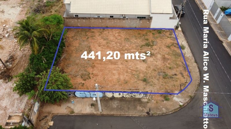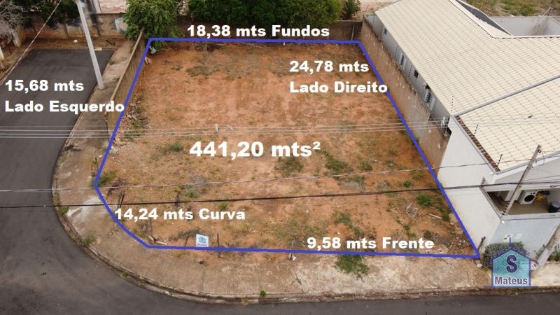 Terreno de esquina medindo 9,56 metros de frente; 14,24 metros em curva; 15,68 metros do lado esquerdo; 24,78 metros do lado direito; e 18,38 metros nos fundos, perfazendo 441,20 metros quadrados de área.